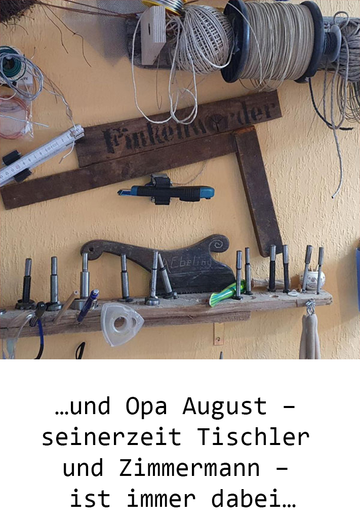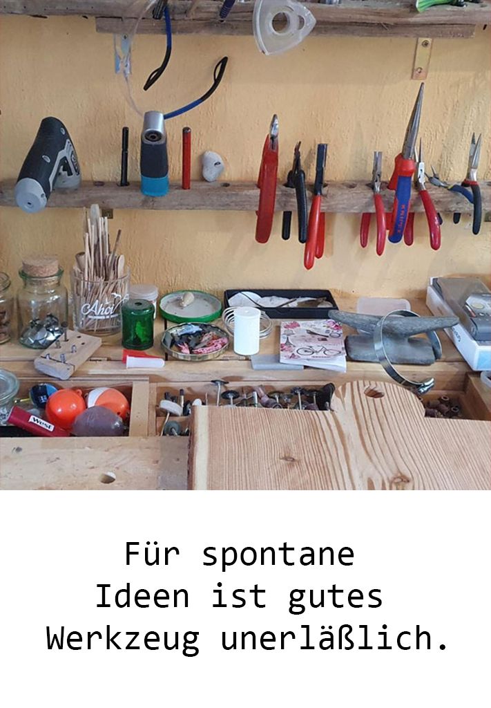 Strandgut sammeln, Mosaik, Schnitzen oder auch Schmieden. Hauptsache etwas Einzigartiges mit den Händen gestalten. 2008 fing meine Reise durch (m)ein Meer von Ideen an. Engelsflügel aus Spiegelsplitter, einen Wassermann aus Holz, Blumenvasen im Holz. Ich suche nicht nach Inspiration, sie findet mich – in einem bestimmten Moment – ein anderer Blickwinkel – einem Gegenstand. In meiner Werkstatt liegt Strandgut von meinen Beutezügen, natürlich auch von den Ufern unserer Elbe.